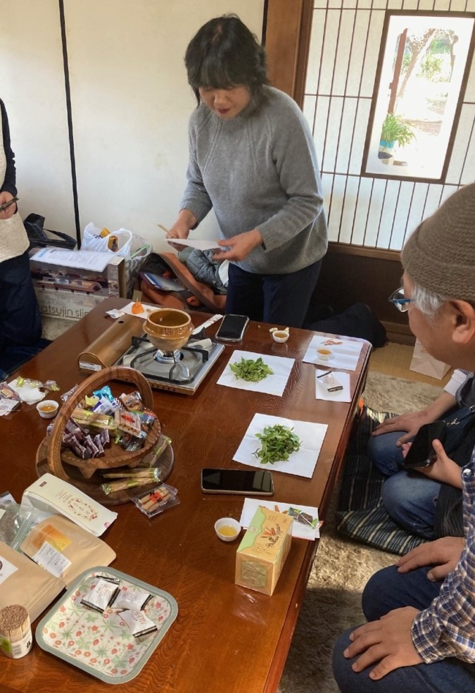 写真は、会場の雨学文庫にある100年を超える茶畑で、冬芽を探して摘んでいるところ。